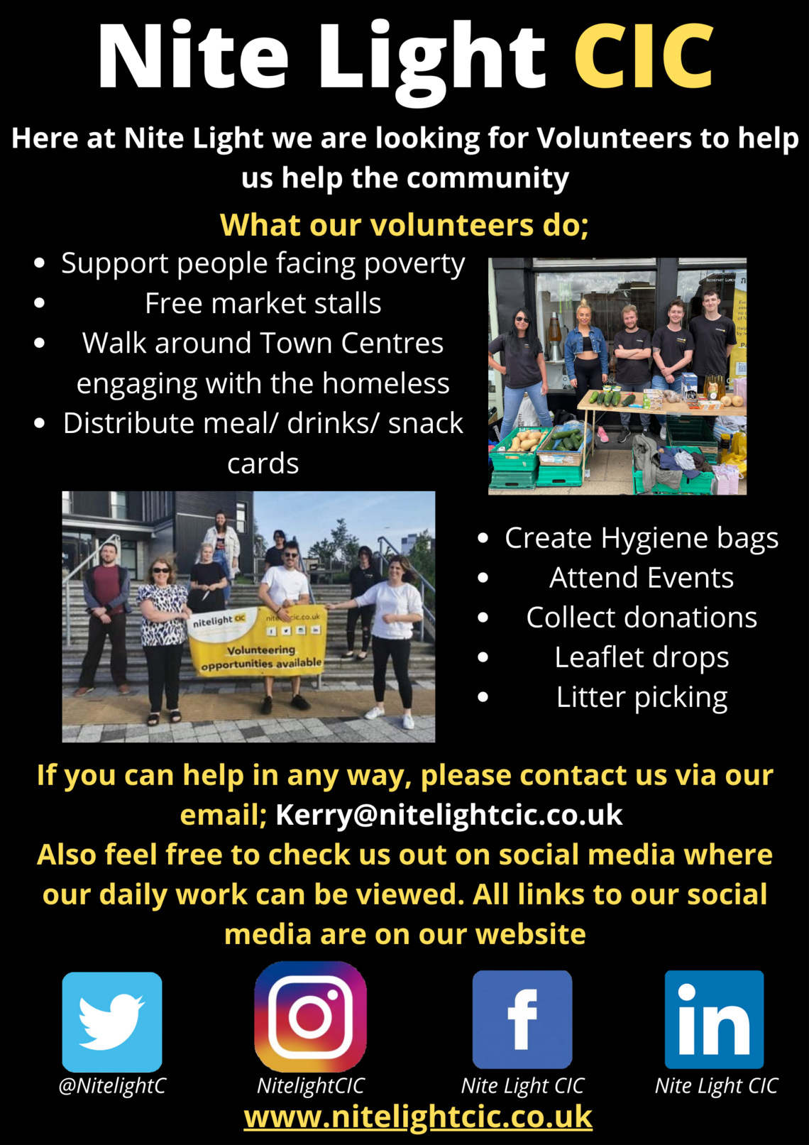 Here at Nitelightcic, we are volunteer led. We have 4 members of staff and 30 volunteers on board. The number of volunteers is increasing on a daily basis which is fantastic. We run various events throughout the week, month and year all within our local community and across the whole of tees valley. The day-to-day activities volunteers are involved with vary from...free market stalls, litter picking, leaflet drop, walkabout local town centres, creating hygiene bags, fundraising, attending local events, sorting through donations and collections. Due to the reduction of various restrictions, we have so many more new projects coming this year. Thanks to our dedicated, pragmatic, multiskilled and multidisciplined team we here at nightlightcic are in the right place at the right time.
